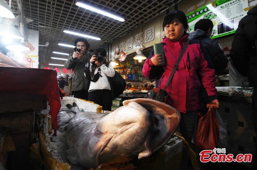 Shoppers take photos of a 1.46-meter-long, over-50-kilogram unknown fish on a stall selling wild fishes in Qingdao, East China's Shandong province, Dec 14, 2014. As no one knows what it is and which price it should be sold at, this unknown fish is still unsold. [Photo: China News Service/ Wang Haibin]