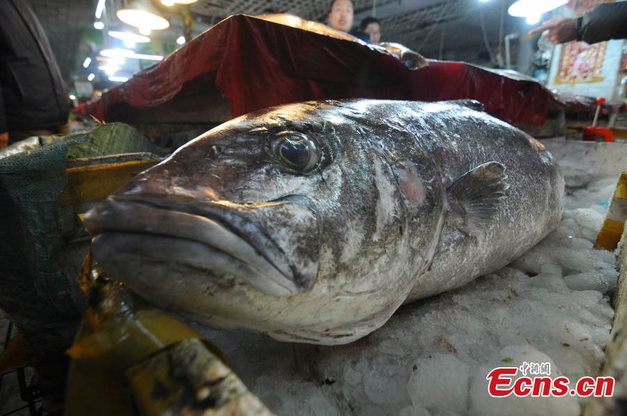 A 1.46-meter-long, over-50-kilogram unknown fish is seen placed on a stall of a market in Qingdao, East China's Shandong province, Dec 14, 2014. Fishermen in Jiaozhou, a county-level city in Qingdao, caught this big unknown fish along with a rare 10-kilogram flatfish in Bohai Gulf on the morning of Dec 12. As no one knows what it is and which price it should be sold at, this unknown fish is still unsold. [Photo: China News Service/ Wang Haibin]