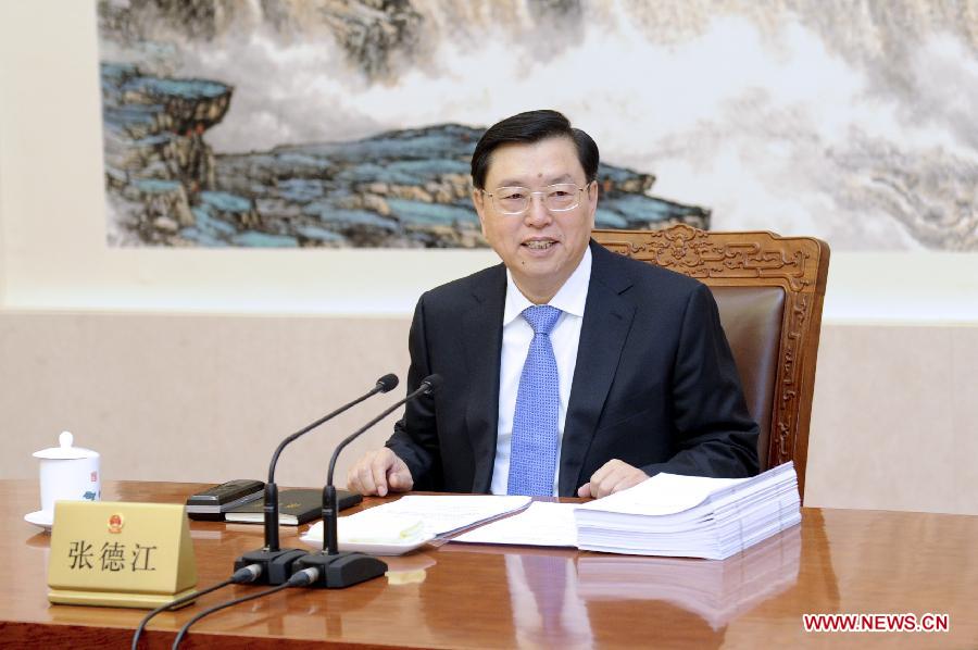 | Zhang Dejiang, chairman of the Standing Committee of China's National People's Congress (NPC), presides over the 36th meeting of the NPC Standing Committee's chairman and vice chairpersons, at the Great Hall of the People in Beijing, capital of China, Dec. 15, 2014. (Xinhua/Zhang Duo) |