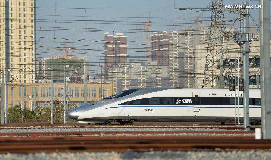 A bullet train leaves the Changsha South Railway Station, a stop of the Shanghai-Kunming high-speed railway, in Changsha, capital of central China's Hunan Province, Dec. 16, 2014. The construction of the Shanghai-Kunming railway in Hunan section has been completed. (Xinhua/Bai Yu)
