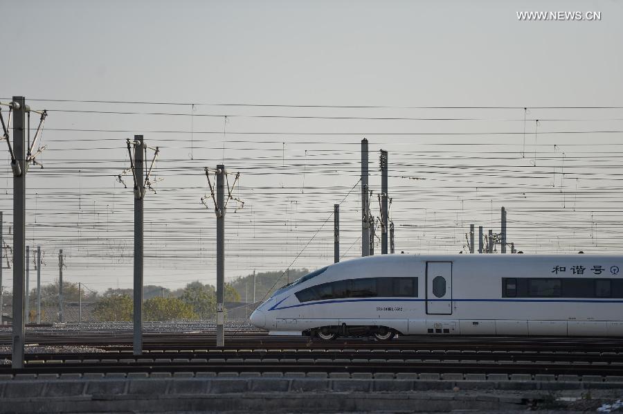 A bullet train leaves the Changsha South Railway Station, a stop of the Shanghai-Kunming high-speed railway, in Changsha, capital of central China's Hunan Province, Dec. 16, 2014. The construction of the Shanghai-Kunming railway in Hunan section has been completed. (Xinhua/Bai Yu)