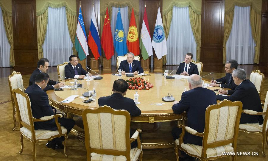 | Kazakh President Nursultan Nazarbayev (C, back) meets with premiers of Shanghai Cooperation Organization (SCO) states, SCO secretary general, and director of the Executive Committee of SCO Regional Anti-Terrorist Structure in Astana, Kazakhstan, Dec. 15, 2014. (Xinhua/Huang Jingwen) |