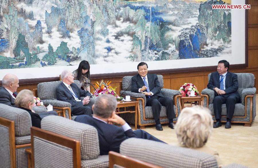 | Liu Yunshan (2nd R), a member of the Standing Committee of the Political Bureau of the Communist Party of China (CPC) Central Committee and secretary of the Secretariat of the CPC Central Committee, meets with representatives of American participants of the second China-US Policy Dialogue in Beijing, capital of China, Dec. 15, 2014. (Xinhua/Wang Ye) |