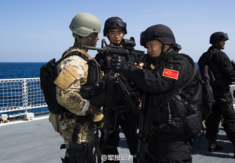 Chinese naval vessels conduct a joint anti-piracy drill with U.S. counterparts in Gulf of Aden and Somali. (Photo/JZ.81.cn)