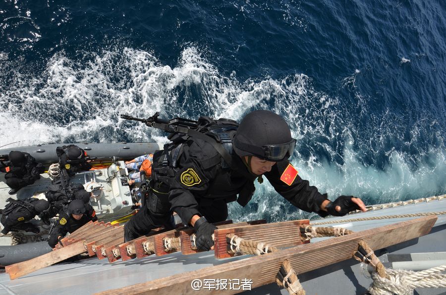 Chinese naval vessels conduct a joint anti-piracy drill with U.S. counterparts in Gulf of Aden and Somali. (Photo/JZ.81.cn)