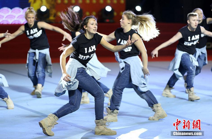 Photo taken on Dec. 14, 2014 shows college cheerleaders performing during the 2nd China Cheerleading Open Tournament at the gymnasium of Nanjing Tech University in Nanjing, east China's Jiangsu province. The competitors are 40 cheerleader teams from nine countries and regions including the US, Germany, South Korea and China. (Photo: China News Service/Yang Bo)