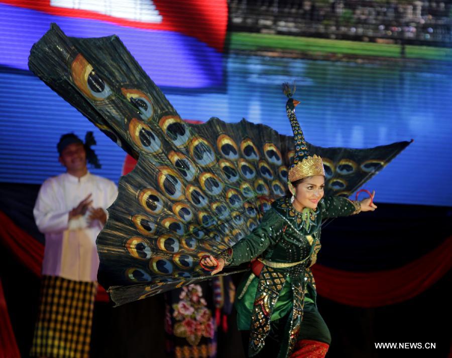 Artists from Laos perform during the China-ASEAN Cultural Exchange Year 2014 Closing Ceremony in Nay Pyi Taw, Myanmar, Dec. 16, 2014. The China-ASEAN Cultural Exchange Year 2014 ceremonially closed in Myanmar's capital of Nay Pyi Taw Tuesday night. (Xinhua/U Aung)