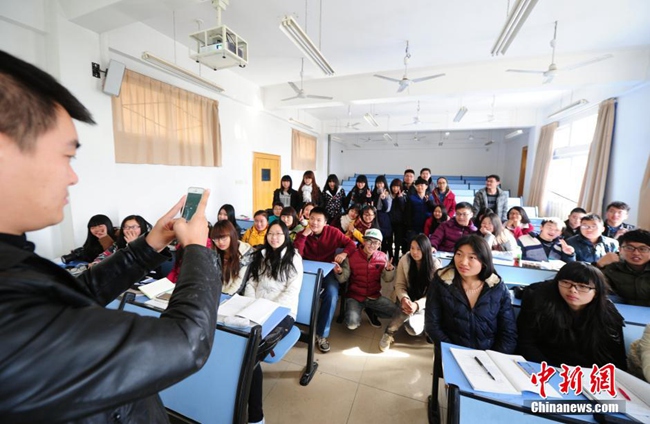 Meng Xiangbin, a photojournalism teacher, takes a group photo of students before and after a class to keep track of attendance at Wuhan Media and Communications College, Huazhong Normal University in Wuhan city, Hubei province on Dec 16, 2014. This new way of calling the roll not only intrigues students’ passion for photography but also reduces the frequency of them arriving late or leaving early, according to Meng. (Photo/ CNS)