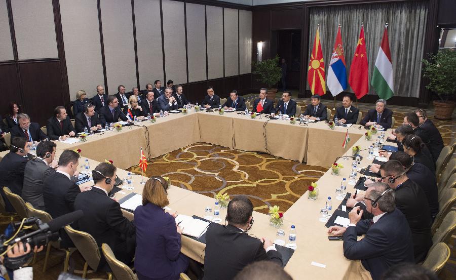 Chinese Premier Li Keqiang meets with Serbian Prime Minister Aleksandar Vucic, Hungarian Prime Minister Viktor Orban and Macedonian Prime Minister Nikola Gruevski in Belgrade, Serbia, Dec. 17, 2014. (Xinhua/Huang Jingwen)