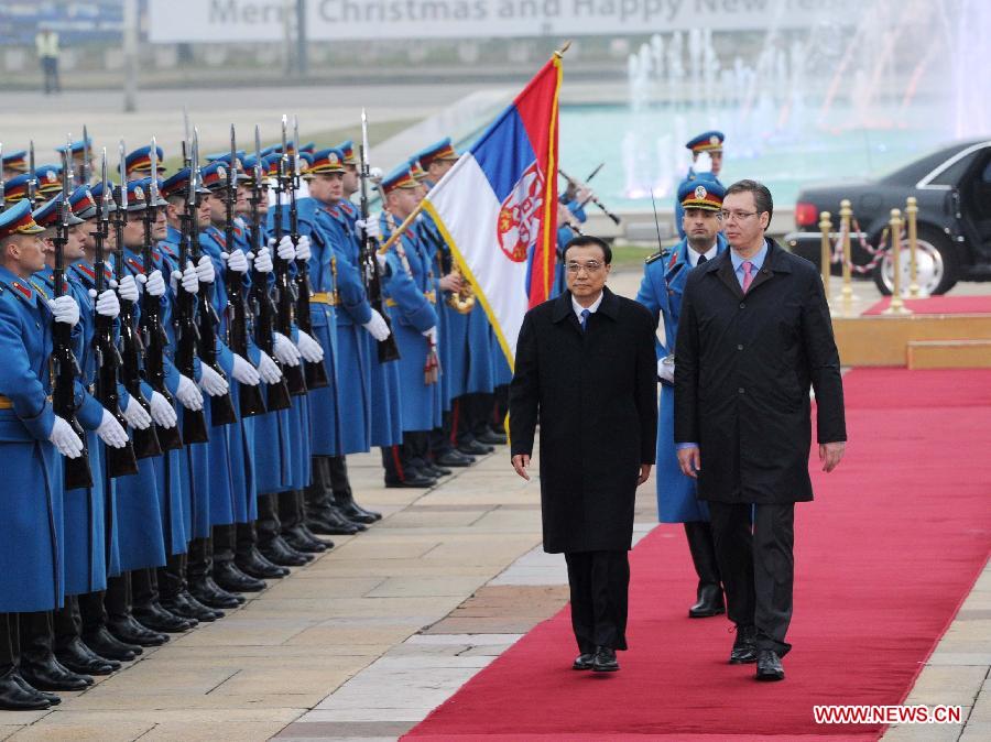 | Chinese Premier Li Keqiang reviews guards of honour with Serbian Prime Minister Aleksandar Vucic during a welcoming ceremony before their talks in Belgrade, Serbia, Dec. 17, 2014. (Xinhua/Rao Aimin) |