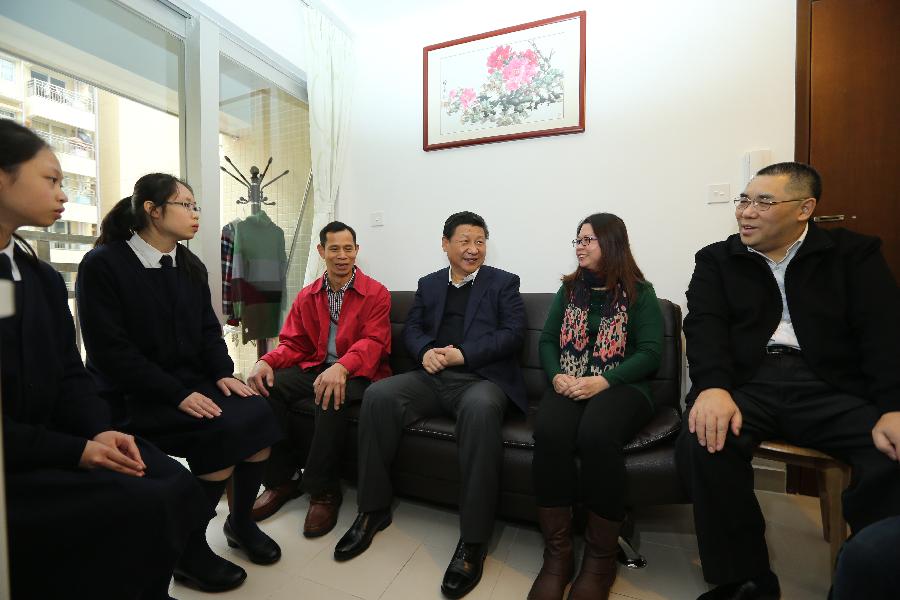 Chinese President Xi Jinping (3rd R) pays a visit to Macao citizen Tam Yuk Ngor (2nd R) and her family, who live at the Seac Pai Van public housing estate, in south China's Macao, Dec. 19, 2014. (Xinhua/Lan Hongguang)