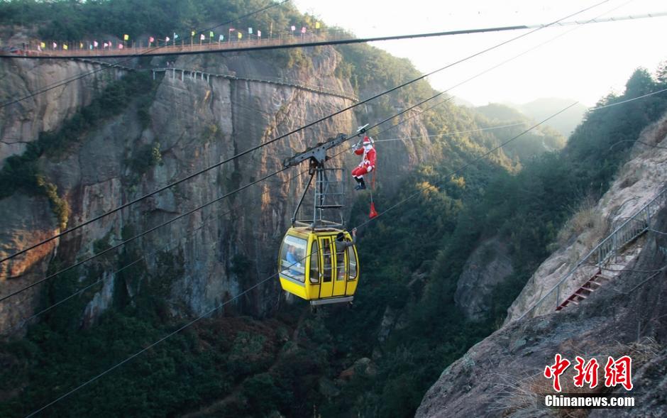 One member of the scenic spot staff, dressed like Santa Claus, climbs the cable car to send gift to visitors for celebrating the up-coming Christmas in China's Hunan Province. (Photo source:chinanews.com)