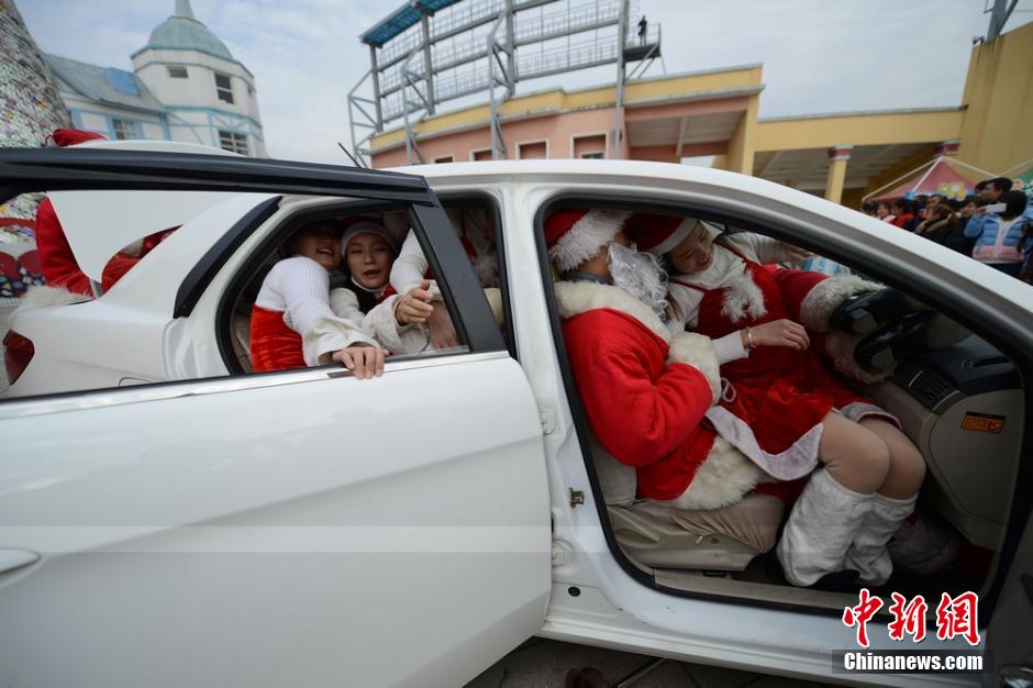 To welcome the Christmas, a fun competition is held at the theme park “Window of the World” in Changsha, central China’s Hunan province on Dec. 18, 2014. Altogether 19 “Santas” squeezed in one car, leaving the audience in amazement. (Chinanews/Yang Huafeng)