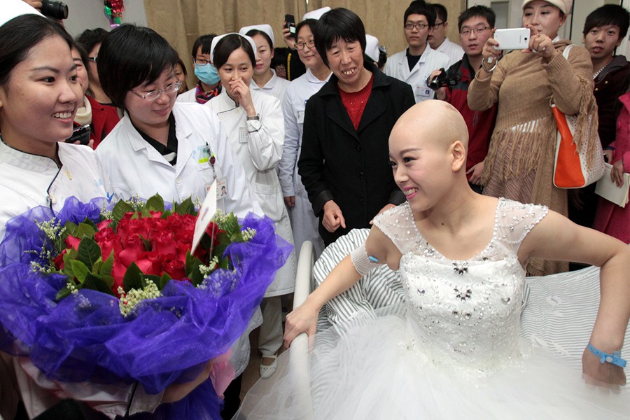 Fan Huixiang, the girl suffering from cancer, gets married with her lover Yu Haining in the Tumour Hospital of Henan Province. In the eyes of his husband, she is the most beautiful bride in the world. (Photo/People's Daily Online)