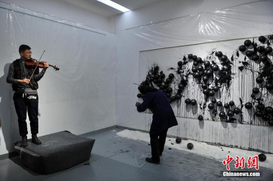 Naxi artists He Libin uses a whip to break the balloons filled with ink hanging on the canvas to complete his artwork "Autumn Scene at the riverside of Fuchun River" at an exhibition in Kunming, southwest China's Yunnan province on Dec. 20, 2014, which has attracted people's attention. (CNS/Ren Dong)