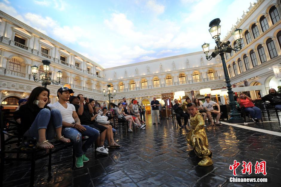 Zhao Zhenghui, 9, performs Shaolin Kong Fu in a stage show named "PANDA" in Las Vegas in the U.S. Zhao's performance won the heart of the spectators. (CNS/Mao Jianjun)