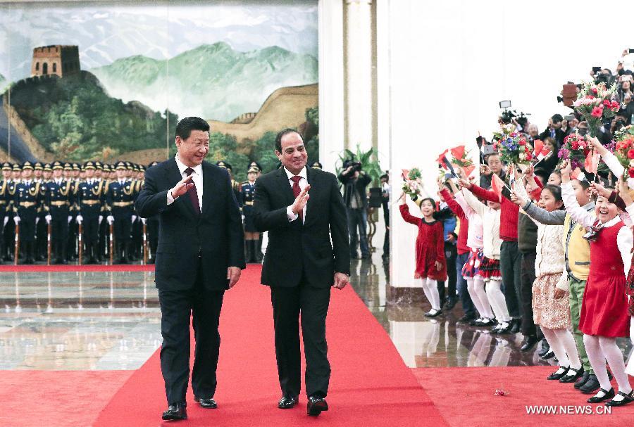 | Chinese President Xi Jinping (L front) holds a welcoming ceremony for visiting Egyptian President Abdel Fattah al-Sisi (R front) before their talks in Beijing, capital of China, Dec. 23, 2014. (Xinhua/Liu Weibing) |