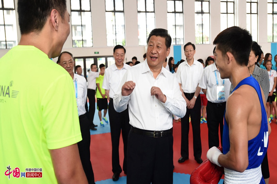 On Aug. 15, 2014, President Xi visits players competing at the Second Summer Nanjing Youth Olympic Games in Nanjing. He asked the players to take care of themselves and avoid body injury. (Photo/China.com.cn)