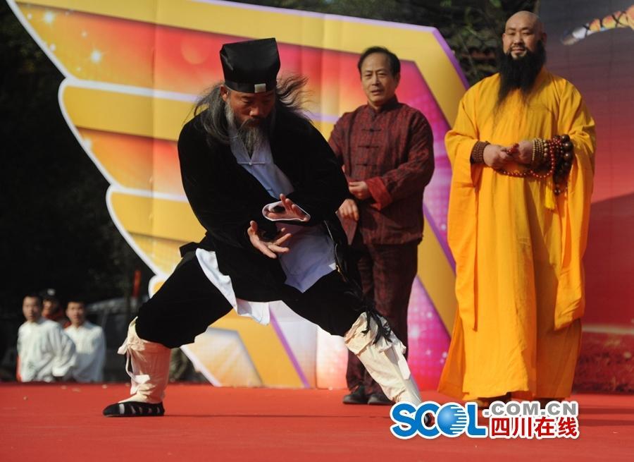 Ten Chinese kung fu masters from different martial art schools including Shaolin, Wudang, Qingcheng, Emei, Laoshan, Kongtong, Taiji and Longquan gather in Chengdu, capital of southwest China's Sichuan province to participate in the Chinese martial arts and cultural festival on Dec. 21, 2014. Their Kong Fu show won warm applause from the spectators. (Photo/SCOL)