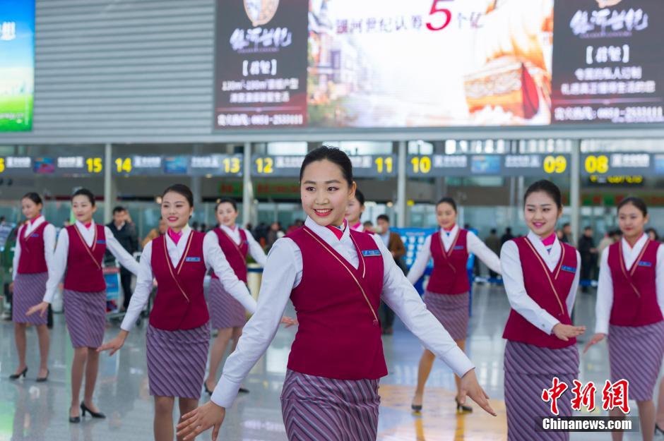 26 flight attendants perform flash mob in Longdongbao Airport Terminal in Guiyang, capital of southwest China's Guizhou province to welcome the upcoming new year on Dec. 22, 2014. (CNS/He Junyi)