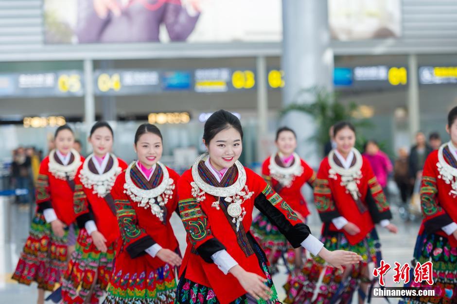 26 flight attendants perform flash mob in Longdongbao Airport Terminal in Guiyang, capital of southwest China's Guizhou province to welcome the upcoming new year on Dec. 22, 2014. (CNS/He Junyi)