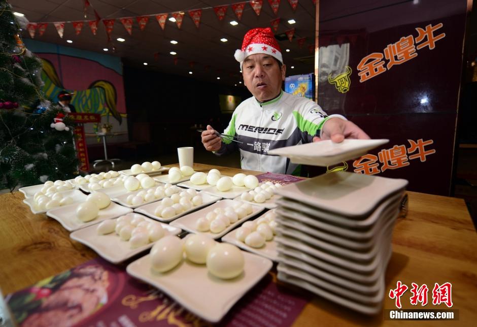 Pan Yizhong takes part in a Christmas challenge and eats up 150 boiled quail eggs and 10 boiled chicken eggs in 37 minutes. (CNS/Yang Huafeng)