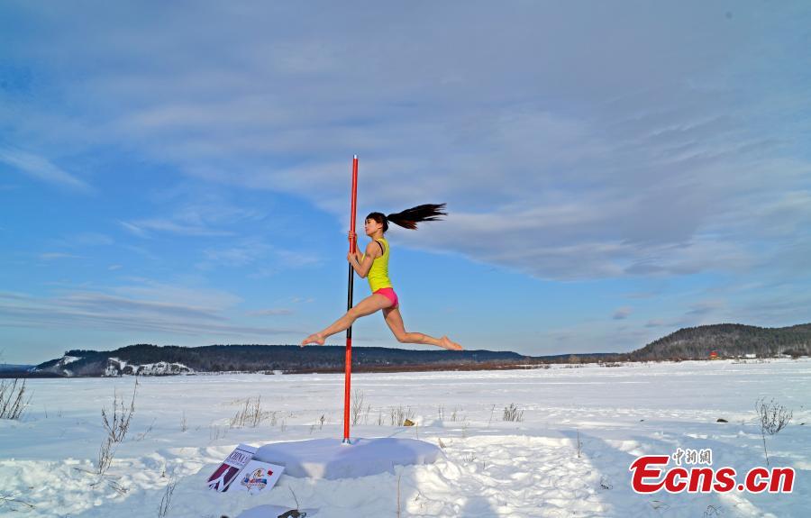 A member of China's National Pole Dance Team performs while temperature dips to minus 50 degrees Centigrade in Beiji village, Northeast China’s Heilongjiang province, Dec 24, 2014. The village, located in the nation's most northerly point bordering with Russia, is known as China's North Pole. [Photo: China News Service/Zhong Xin]