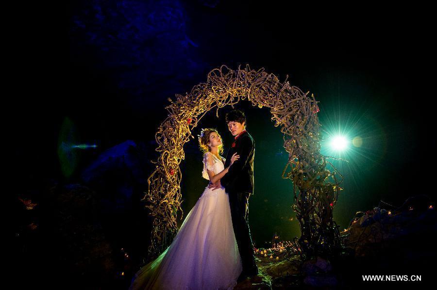 A couple show on their wedding ceremony at a karst cave in Chongqing, southwest China, Dec. 24, 2014. (Xinhua/Liu Chan)