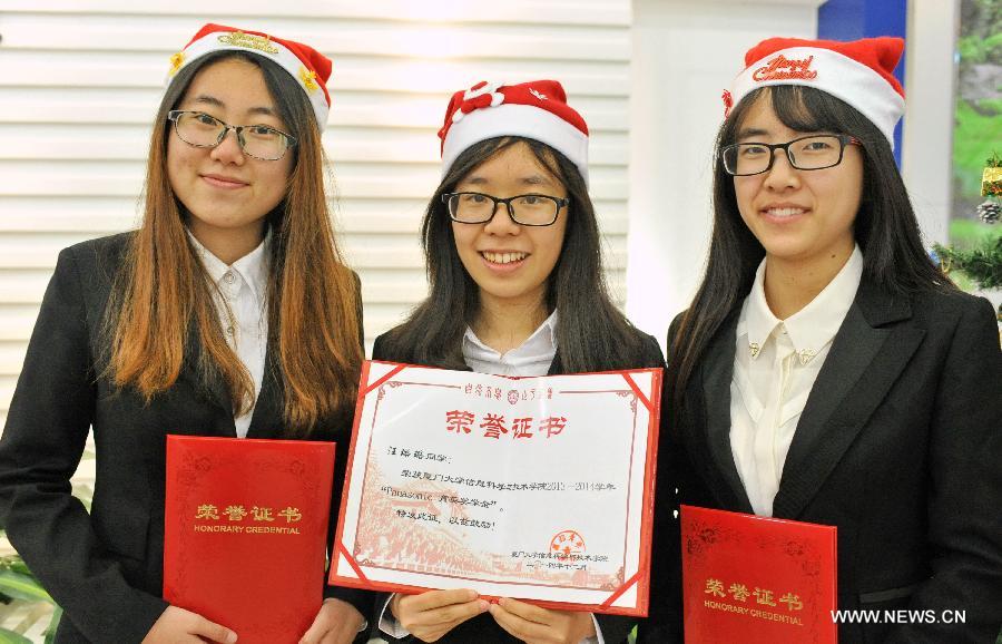 Students show their credentials of scholarship at Xiamen University in Xiamen, southeast China's Fujian Province, Dec. 25, 2014. Ten students of the university were rewarded scholarships provided by Panasonic on Thursday. (Xinhua/Lin Shanchuan)