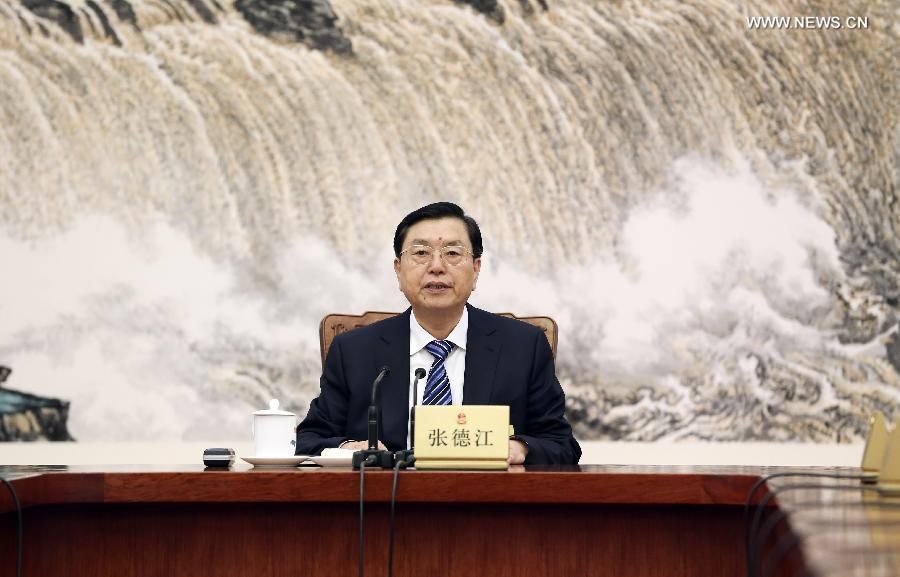 Zhang Dejiang, chairman of the Standing Committee of China's National People's Congress (NPC), presides over the 38th meeting of the NPC Standing Committee's chairman and vice chairpersons, at the Great Hall of the People in Beijing, capital of China, Dec. 26, 2014. (Xinhua/Ding Lin)