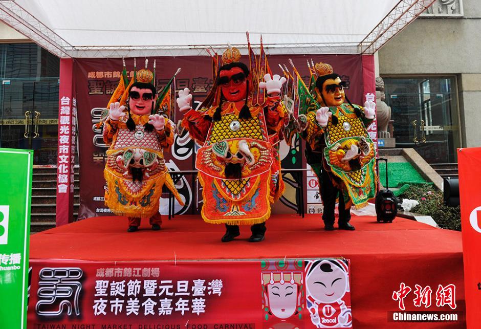 Three famous night markets in Taiwan - Shilin, Fengjia, and Liuhe - come to Chengdu Dec. 24, 2014. In addition to delicious food, the Electric Techno Neon Gods, a subcultural performance which combines traditional Taiwan folk performance with modern pop music, and face-changing of Sichuan Opera can also be found at the food carnival. (Chinanews/An Yuan)