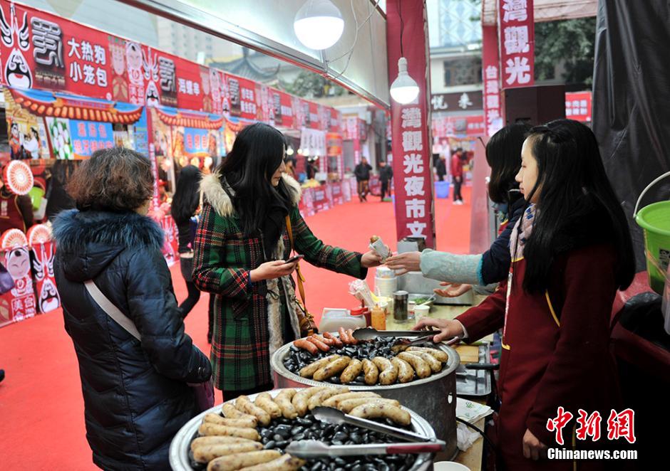 Three famous night markets in Taiwan - Shilin, Fengjia, and Liuhe - come to Chengdu Dec. 24, 2014. In addition to delicious food, the Electric Techno Neon Gods, a subcultural performance which combines traditional Taiwan folk performance with modern pop music, and face-changing of Sichuan Opera can also be found at the food carnival. (Chinanews/An Yuan)