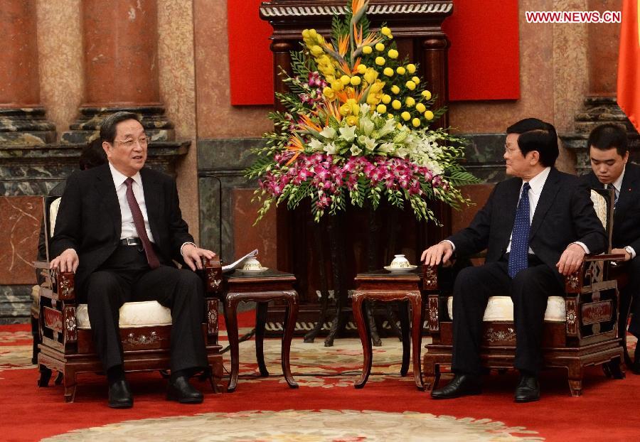 Yu Zhengsheng (L), a member of the Standing Committee of the Political Bureau of the Communist Party of China (CPC) Central Committee and chairman of the National Committee of the Chinese People's Political Consultative Conference, meets with Vietnamese President Truong Tan Sang in Hanoi, capital of Vietnam, Dec. 26, 2014. (Xinhua/Liu Jiansheng)
