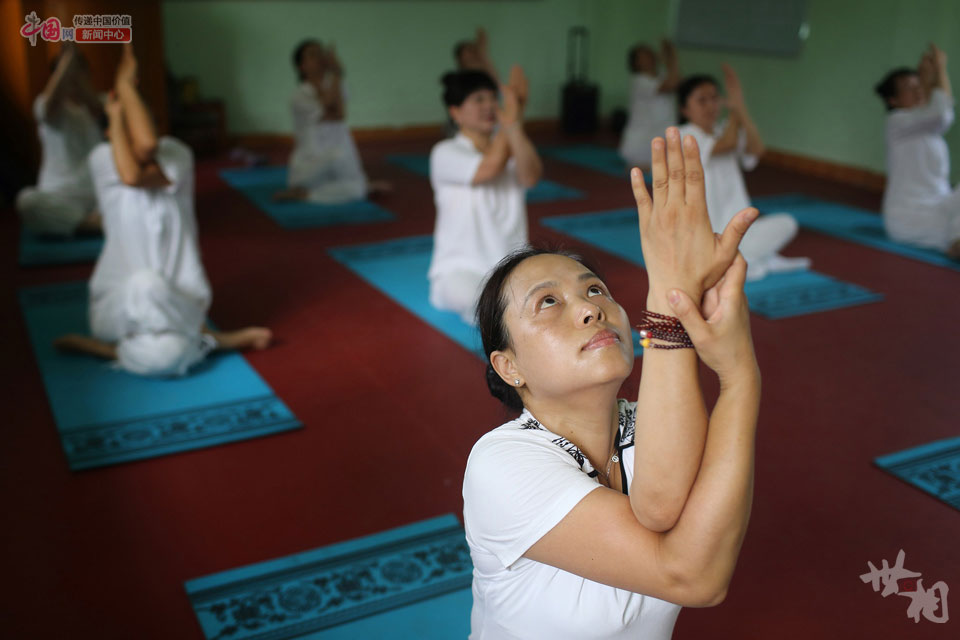 Team members practice yoga to the instructions of Gu Wenzhi.(Photo/China.org.cn)