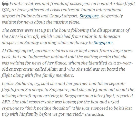 The Jakarta Post reports that the Indonesian vice president, Jusuf Kalla, is leading the search for the missing AirAsia flight. Kalla said the search is called off until Monday.
