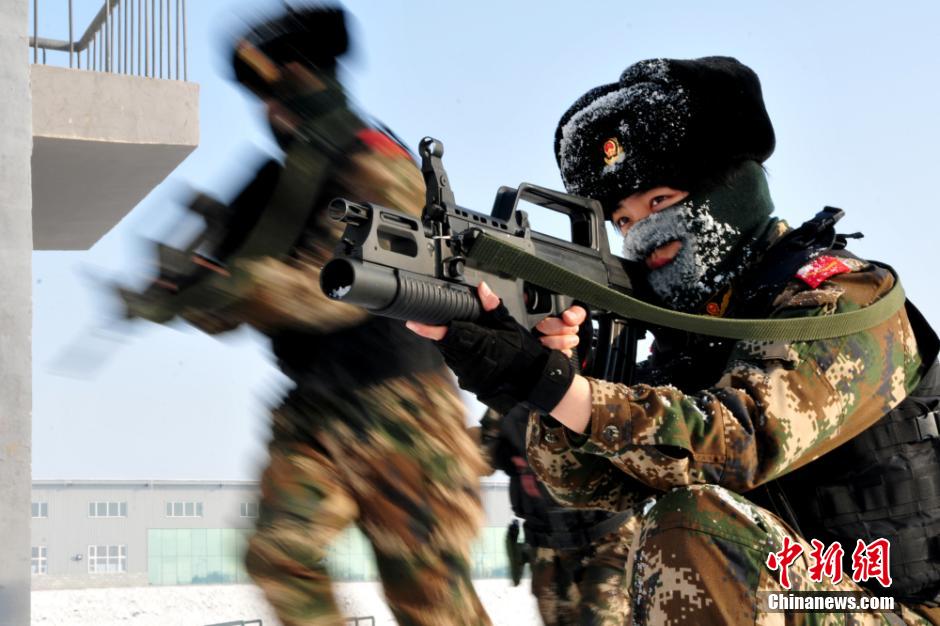 Female SWAT team members in Xinjiang train under harsh weather condition, Dec. 25, 2014. Members of this team are all with excellent physical qualities and educational backgrounds. After a long-term systematic training, they will undertake the mission of protecting the people and maintaining safety of the society. (Chinanews/Fan Xinyu)