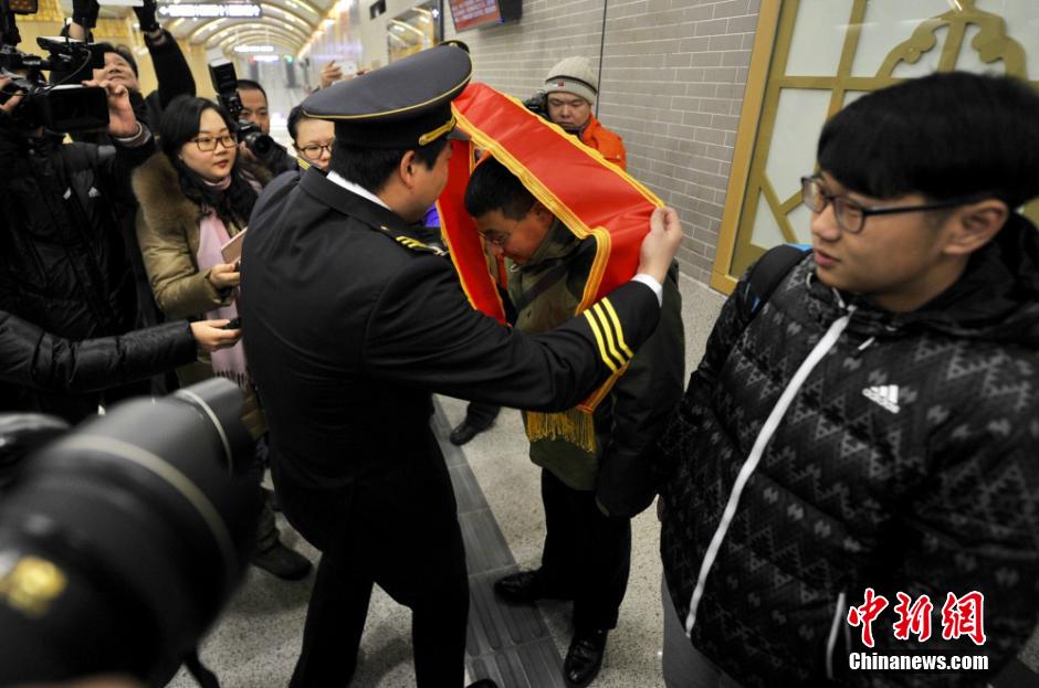 Photo taken on Dec. 28, 2014 shows the first passenger of subway Line 7 at a transfer station in Beijing. Beijing began trial operations of four new subway lines on Sunday in the latest effort to ease the city's traffic jams. (China News Service/Jin Shuo)