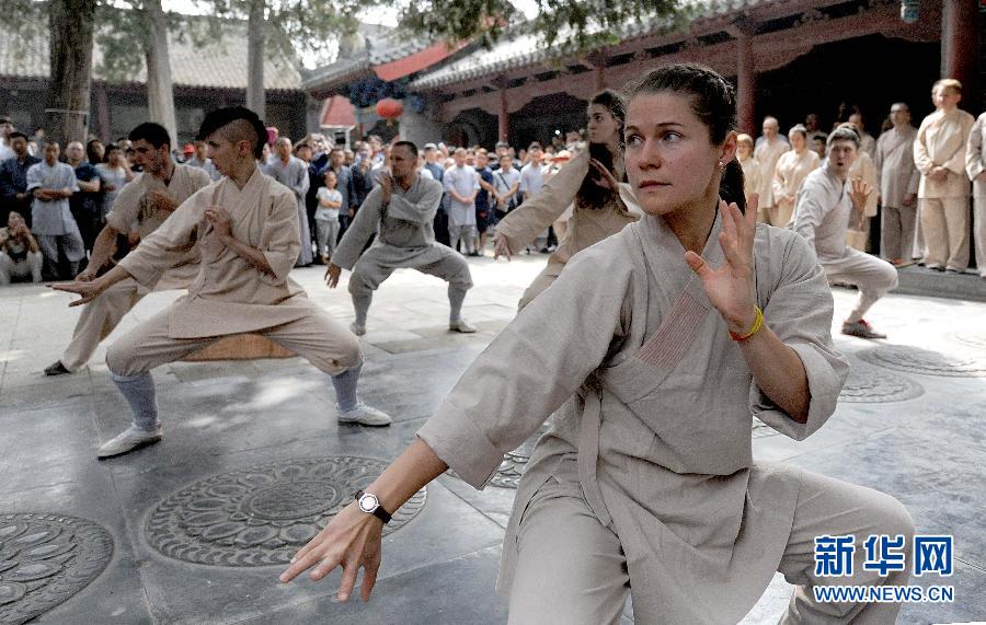 Kung fu enthusiasts from “Shi Yanbin Kong Fu School” in Russia visit the Shaolin Temple in Dengfeng, central China’s Henan province on July 6, 2014. (Xinhua/Li An)
