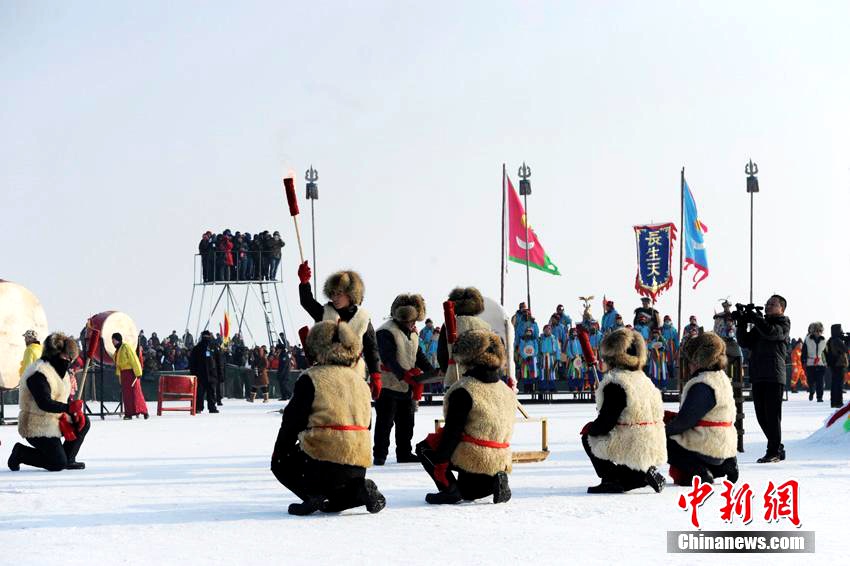A ceremony of offering a sacrifice to the Lake God and waking up the fishing net is held at Chagan Lake in Songyuan city, northeast China's Jilin province, Dec. 28, 2014. Chagan Lake is the only area in China where traditional Mongolian ice fishing method is used. (CNS/ Zhang Yao)