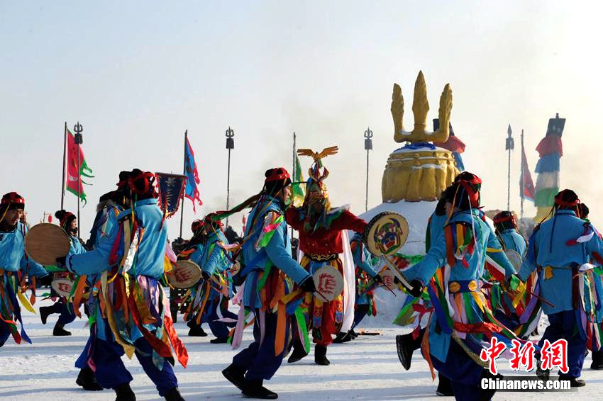 A ceremony of offering a sacrifice to the Lake God and waking up the fishing net is held at Chagan Lake in Songyuan city, northeast China's Jilin province, Dec. 28, 2014. Chagan Lake is the only area in China where traditional Mongolian ice fishing method is used. (CNS/ Zhang Yao)