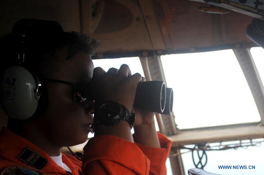 A member of Indonesian air force searches for suspicious objects on the Hercules C-130 during a search operation of AirAsia Flight QZ8501 on the sea of the Karimata Strait, Indonesia, Dec. 29, 2014. Suspicious objects were detected on Monday in the Java Sea where an AirAsia plane disappeared as the search operation expanded with more countries joining the sea and aerial hunt. (Xinhua/Agung Kuncahya B.)