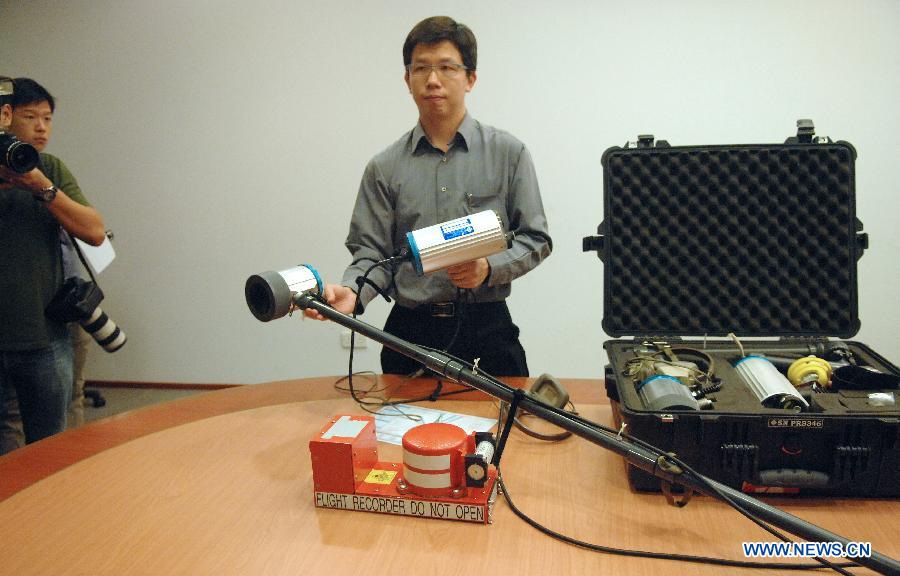 | A rescue professional from Singapore demonstrates the search and rescue equipment that will be used in the search for the missing AirAsia flight QZ8501 at Singapore's Changi Airport, on Dec. 29, 2014. The AirAsia flight QZ8501 scheduled to arrive at Changi Airport on Sunday lost contact with Indonesian air traffic control in Indonesian flight information region. Singapore has pledged support and will dispatch aircraft and equipment to support the search and rescue efforts in Indonesia. (Xinhua/Chen Jipeng) |