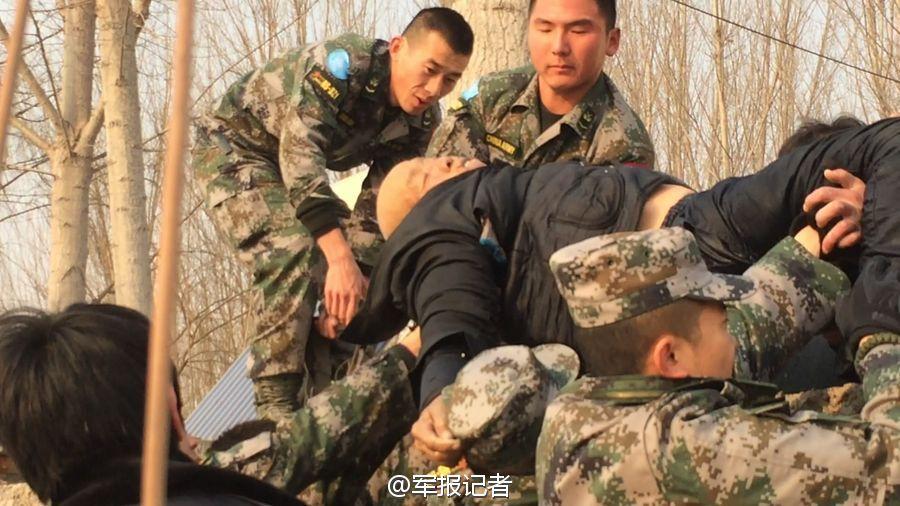 On Dec. 27, two men accidentally fell into an ice hole on a lake in Laiyang, east China’s Shandong province. Zhang Yulei and Liu Haiwen, two PLA soldiers who were on duty nearby, rapidly came to the accidental site to rescue the two drowning men with electric wires and other things available. Later, more soldiers took part in the rescue. Unfortunately, one of the men died, and the other is all right. Zhang Yulei was frostbitten and hospitalized. (Photo source: official microblog of PLA Daily)