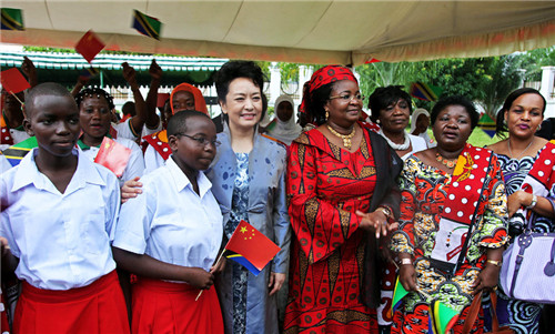 Peng Liyuan posed for a photo with Salma Kikwete and Tanzanian students. Peng Liyuan, wife of Chinese President Xi Jinping, was accompanied by her Tanzanian counterpart Salma Kikwete at the Tanzanian Women Development Foundation on Mar. 25, 2013. (Photo/Xinhua )