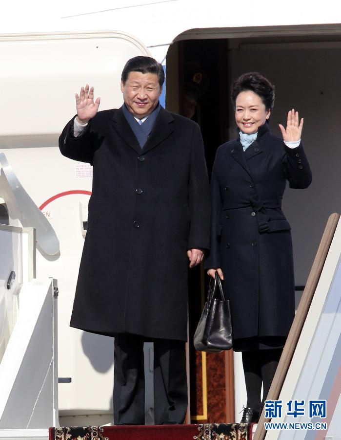 Chinese President Xi Jinping (L) and his wife Peng Liyuan wave upon their arrival in Moscow, capital of Russia, March 22, 2013. Peng Liyuan made her debut as China's first lady on the international stage.(Photo/Xinhua)