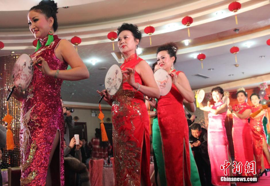 A group of old ladies launch a Cheongsam show in their pursuit of beauty in Lanzhou,northwest China's Gansu province on Dec. 29, 2014. (Chinanews.com/Liu Yutao)