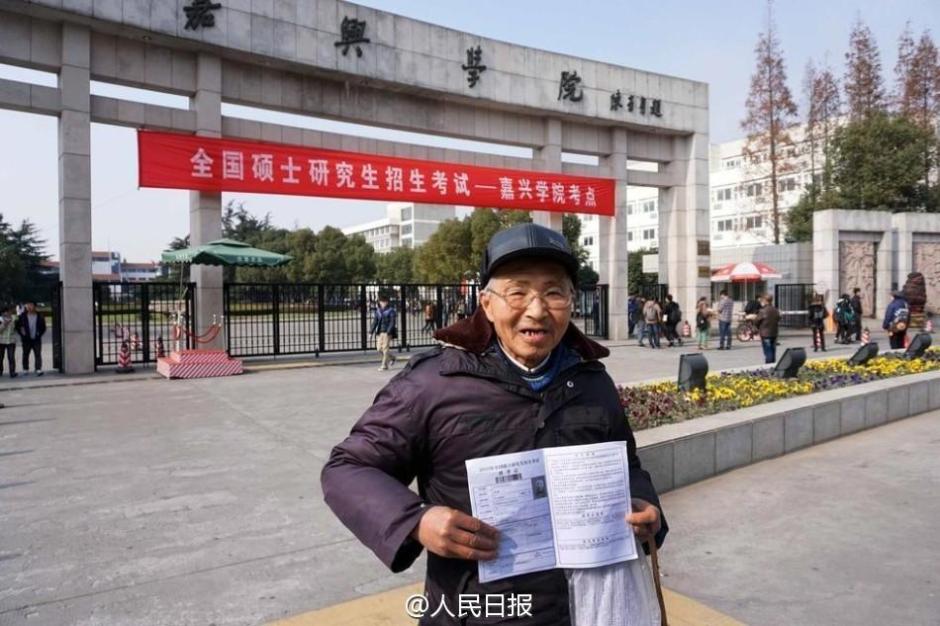 Zhou Weimin, 73, takes part in the postgraduate entrance examination in 2014. He got admitted to the department of physics of Hangzhou Normal University in 1960 and dropped out one year later. He has taken part in the college entrance examination for five times since 2003. (Photo/Microblog of People's Daily)