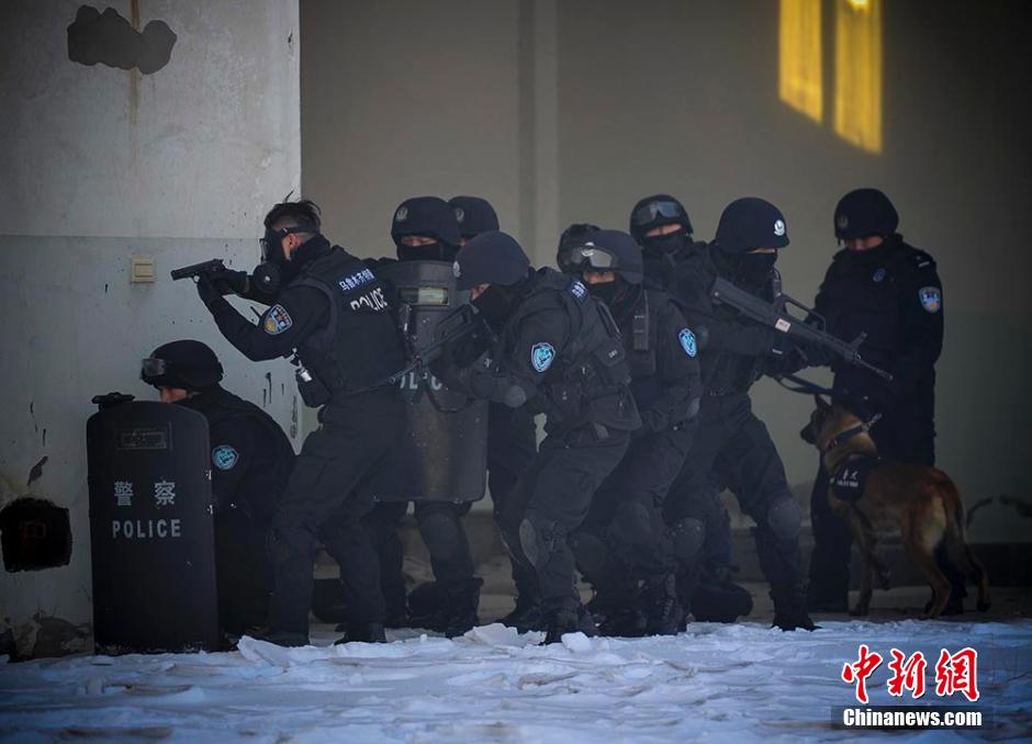 A SWAT team holds an anti-hijacking drill in Urumqi, northwest China’s Xinjiang Uygur Autonomous Region on Dec. 29, 2014. “Gangsters” hijacked several “hostages” with guns and knives and hid in a deserted factory. The SWAT members blitzed on “hijackers” and rescued the “hostages” rapidly. (Chinanews/Fang Tao)