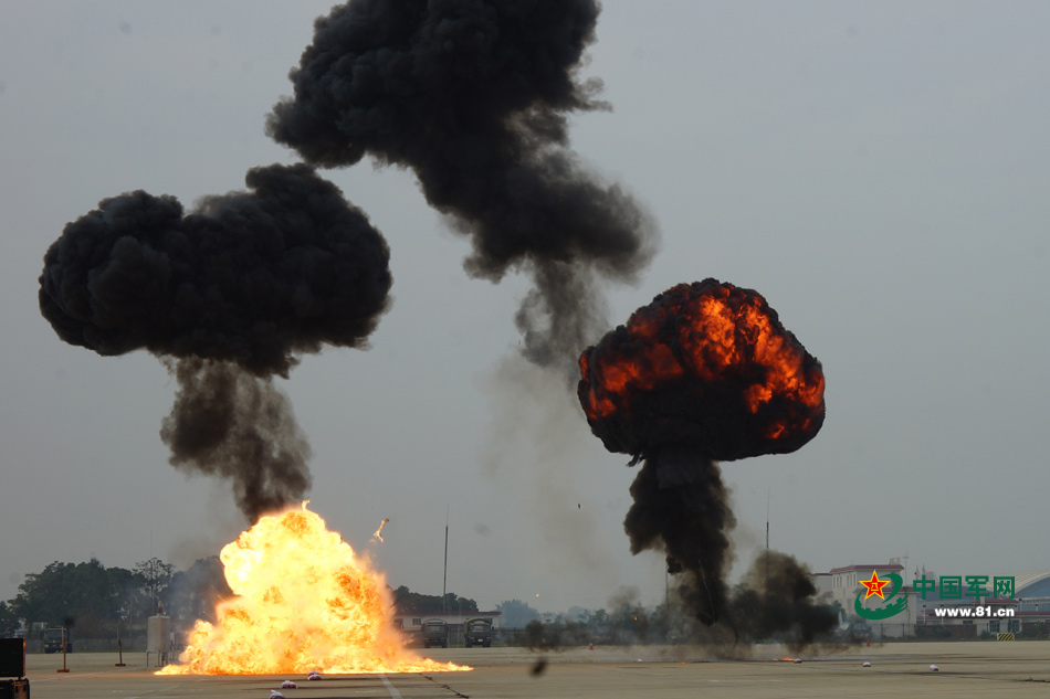 An air force station of Guangzhou military region holds an emergency drill on Dec. 24, 2014. The scenario was that the station was bombed in an air raid and many planes were on fire. Soldiers responded rapidly to defend the airport and resume the normal operation of the station. (Photo source: www.81.cn)