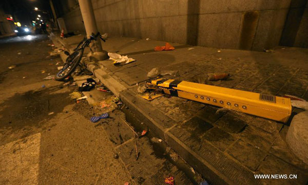 This photo taken on the early hours of Jan. 1, 2015 shows the scene of a stampede that caused casualties among people who took part in new year celebrations in east China's Shanghai. New Year celebrations in the bund area went astray early Thursday morning as a stampede resulted in casualties in east China's Shanghai. The injured people have been set to the No. 1 People's Hospital of Shanghai. (Xinhua/Ding Ting)